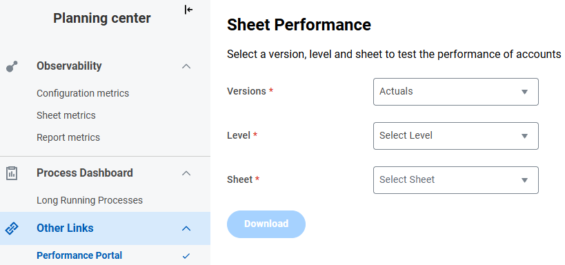 The Performance Portal Report enables users to evaluate the account performance for sheets in the selected versions and levels. This gives users insight to identify which accounts need to be optimized for faster sheet loads. It saves time and effort during each stage of modeling and will ensure it’s optimized. This data can be exported to excel and will show the account codes for each child account and the evaluation time in seconds. Enter the required fields and select download.