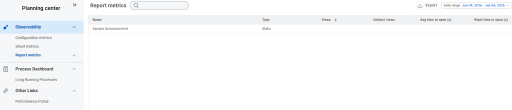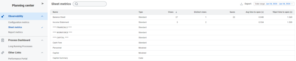 Workday Adaptive’s Planning Center can be found within modeling and is used to optimize model design and performance. The Planning Center is broken out into sections of Observability, Process Dashboard, and Other Links. These sections break out further into reports where users can gather useful insights into different areas of Adaptive. By leveraging the Planning Center users can make the most-informed design decisions at any stage of modeling. It’s important to model with best practices in mind while meeting all requirements for your organization. Optimizing the model with the Planning Center will make performance and maintenance much more efficient in the long run. This post will briefly cover the various features of the Planning Center but will focus on the newest functionality added as part of the 2025 R2 release. The Sheets Performance Evaluator provides users with an excel export of the account code for each child account and its evaluation time in seconds.