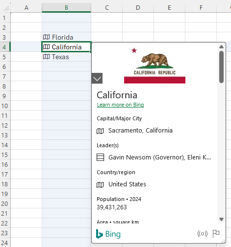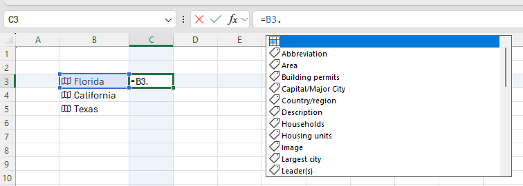 You can also integrate geographical data via a formula. When you point to a cell with a linked data type and enter a period, the list of available data will appear in a drop down menu.