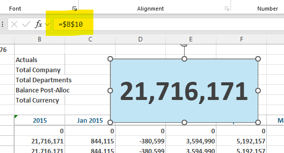 You will now see the text box linked to the cell in the formula bar. From here, you can change the format of the textbox to make the number stand out (ex: larger fonts, background colors, etc.).