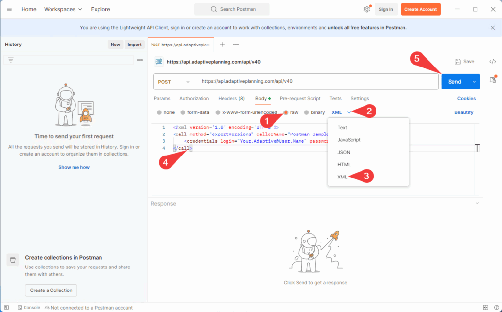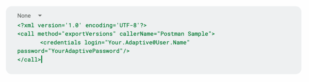 - 3. Select the “Body” tab then change the data type to “raw” and set the data type to “XML” then enter the following XML payload (and change the credentials to match your Adaptive’s account credentials):