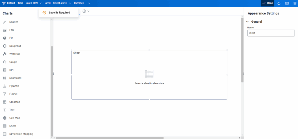 You have the functionality to add Cube, Modeled, and Standard sheets side by side and edit them as if you were in the Sheets tab. In the sheet itself, you can enter at any level and save your changes. From there you are able to see the changes to the financials that are reflected in other charts and graphs on the dashboard.