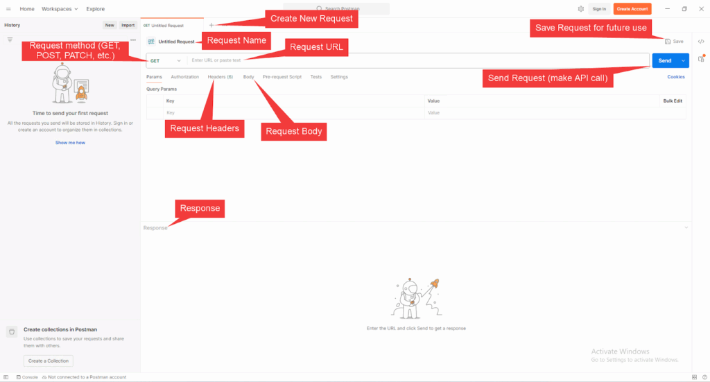 - Collections: Collections are groups of related requests that can be saved and reused. You can create new collections or import existing ones from other users.